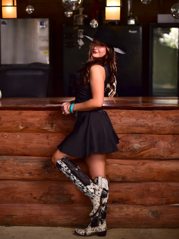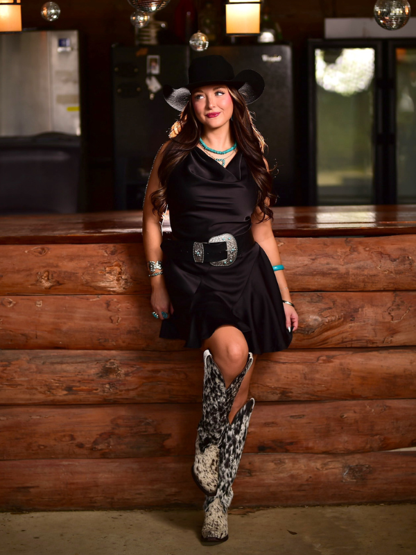 This dress may be simple but it is also insanely stunning. We all love a good little black dress but theres something about this dress that sets it a part from the rest. This dress is ridiculously flattering on and can be easily styled your own way. This dress remind me of something Ella Langley would wear on stage and that makes me love it even more. You can style this dress with any color boots, hat, and belt! Snag this gorgoeus dress for the rodeo!