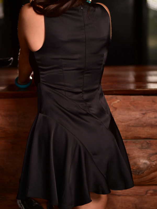 Reese is wearing a medium. This dress is TTS. This dress is a satin material with cowl neck and flowy style bottom. This dress features gorgeous stitching that flatters at the waist. This dress has a back zipper and lining as well. This dress is comfortable form flattering, and Reese was able to wear a regular bra with this dress.